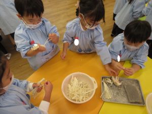 昨日の年中のさつまいも洗いに続き、年少・年長もクッキングをしました。