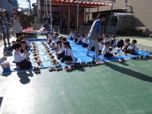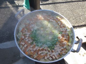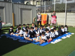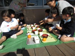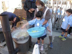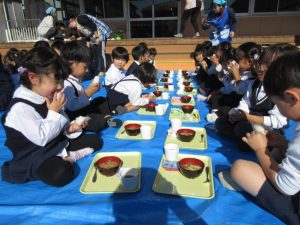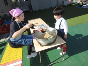 食事は全学年がプレーコート・芝生広場・テラスに集まりお外でほかほか美味しい芋煮を食べました!