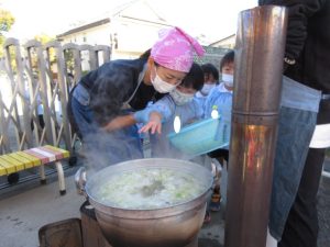 一人一回わしづかみをして具材を鍋に入れるお手伝いをしました。