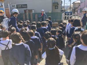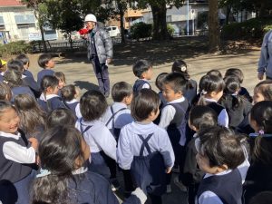 今回は、警戒宣言発令時を想定した避難訓練を行いました。放送を聞いてまず、クラス毎、園庭に避難しました。それから、姫百合幼稚園の避難場所になっている、近隣の公園、若葉緑地公園に全園児で移動しました。ちゅうりっぷ組もはじめて園外に出ましたが、上手に歩いて避難する事が出来ました。