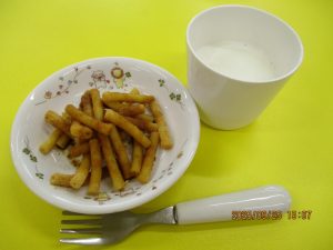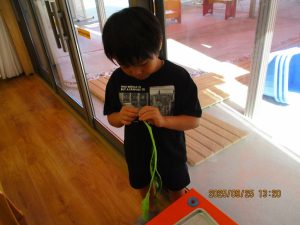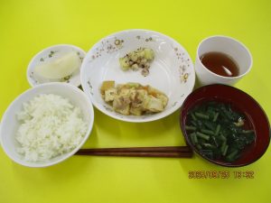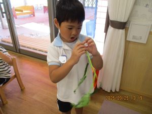 今日はスープに入っていた、空心菜(くうしんさい)を展示しました。茎の中がストローのように空洞になっていることを説明すると、興味津々に穴を覗き込み「覗けるよ!!」と楽しそうに大発見。「空心菜を食べると、運動会で元気に走れるよ」と伝えると、嬉しそうにたくさん食べる子や、挑戦して口に運ぶ姿も見られました。