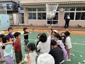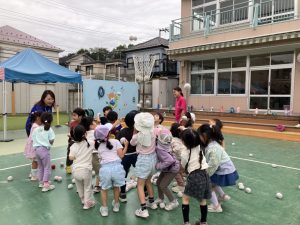 笛の合図で曲が止まると赤チームも白チームも一生懸命投げていました。
