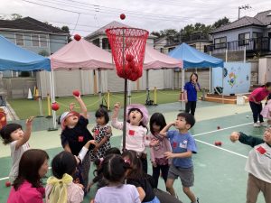 秋の風が涼しく気持ちのいいお天気の中、赤チームと白チームに分かれて園庭でミニ運動会を開催しました😊
