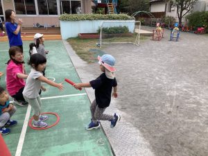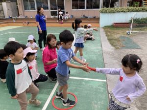 運動会で年中組、年長組の姿をよく見ていたので年少組も上手にバトンパスができていましたよ!