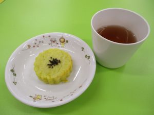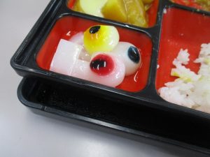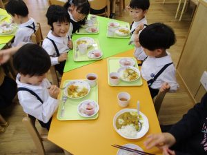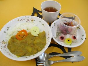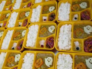 今日は、ハロウィンにちなんだ特別メニューでした☺チキンカレーの上にジャック・オーランタンの人参やおばけの形にくり抜いたチーズをトッピング👻さらに、目玉の形をした寒天で作ったゼリーを一つ一つ手作りしました。赤や青、黄色の目玉ゼリーを見て「食べられるの?」「こわ~い!」と少し怖がる子もいましたが、「カルピス味で美味しかったよ」と嬉しい声も聞こえました。ハロウィンは、もともと秋の収穫をお祝いする日です。季節の恵みに感謝しながら、一足早いハロウィンを楽しめました🎃👻