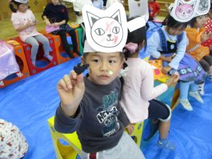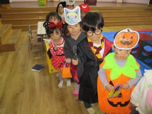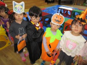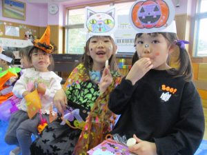 今日は、ミッキーの子ども達が楽しみにしていた、ハロウィンおやつ🎃子ども達は、思い思いの仮装を楽しみながら、お菓子を貰いにやってきました☺「トリックオアトリート!!お菓子をくれなきゃいたずらするぞー」と元気いっぱいの声が響き渡りました。給食室からは、黒猫にコウモリ、マシュマロのクッキーにデコレーションをし、ハロウィンクッキーを配りました👻大切そうに自分達で作ったバックにクッキーを入れる姿がとても可愛かったです☺