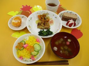 11月のお誕生日のみなさん、おめでとうございます🎉今日は七五三のお祝いも一緒に。なるとにも「祝」の文字でこどもたちの健やかな成長を祝います㊗また、ちらし寿司と煮物にもみじをちらして秋の深まりを表現し、目で楽しみ味も楽しめる特別メニューにしました。ちらし寿司は食べ慣れない子が多くいましたが、まずは食べてみる、その挑戦する姿勢がどんどんみられるようになってきて私達も嬉しく思います😊