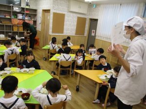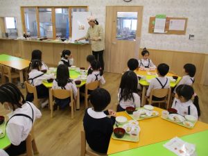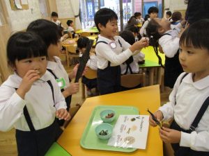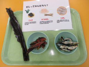 11月24日は語呂合わせで「いい日本食の日」です。この日は和食文化の保護・継承を目的として、ユネスコ無形文化遺産にも登録されている和食の大切さを再認識する日なのです。なので姫百合幼稚園では今週、出汁をきかせた和食の給食をだしています。25日には年中さん、そして今日は年長さんに和食ってなにかな?出汁ってなにからできてるのかな?お話しをしました。年長さんにはちょっとむずかしい和食クイズも出題!どんなクイズだったのかぜひお子さんに聞いてみてくださいね。色んな種類の出汁を触って嗅いで日本文化のすばらしさを身近に感じてもらえたらな、と思います。こどもたちは出汁のきいた和食が大好きで今日も良く食べていました🍚