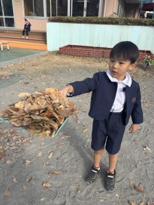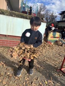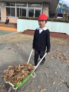 園庭では、子どもたちが一輪車や、ちりとりなどを使い、一生懸命落ち葉を集めて運んできてくれました😊