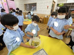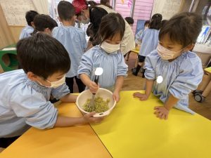 子どもたちが収穫した、さつまいもを使いました。まずは、ほかほかに蒸し上がったさつまいもをマッシャーで、力いっぱいギュッ、ギュッと潰しながら「やわらかいね」「甘い匂いがするよ」と感触や香りを楽しみました😊それから、寒天液を作り、混ぜて冷やしました。大人気でした。