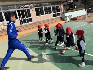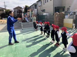 今日は、体育講師の小野田先生にはじめて、ちゅうりっぷ組もほんの少しの時間、体育指導をして貰いました。