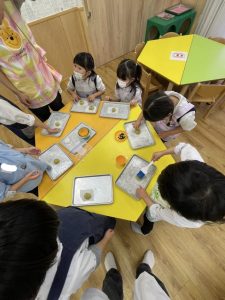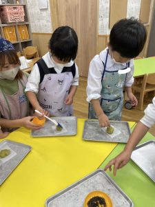 蒸したさつまいもをマッシャーで潰し、ひとりひとりが好きな形に成形しました。今回使用したさつまいもは水分量が多く、やわらかくて形を作るのが少し難しい場面もありましたが、年長さんらしく工夫しながら、上手に仕上げてくれました😊