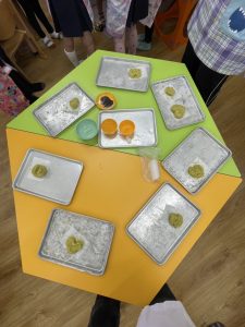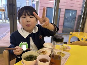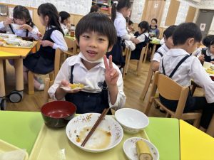 焼き上がったスイートポテトは、きれいな黄金色!ひと口食べると「甘くて美味しいよ」「柔らかい!」と声が上がり、ほとんどの子が完食していました。スイートポテトから先に食べる子、給食を食べ終えてから最後のお楽しみに取っておく子など、食べる順番もそれぞれでした😊