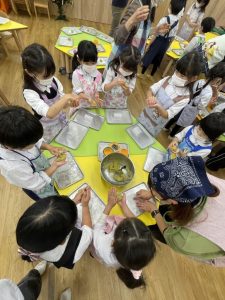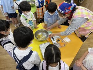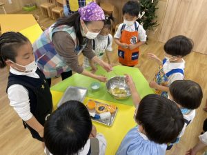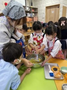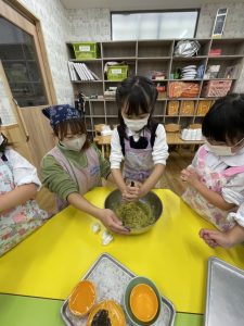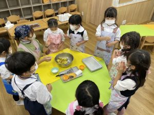 蒸したさつまいもをマッシャーで潰し、ひとりひとりが好きな形に成形しました。今回使用したさつまいもは水分量が多く、やわらかくて形を作るのが少し難しい場面もありましたが、年長さんらしく工夫しながら、上手に仕上げてくれました😊