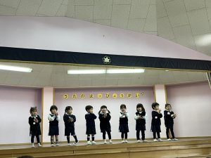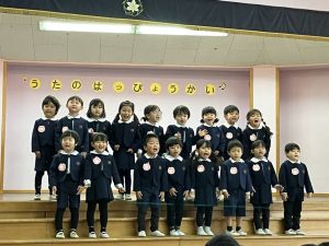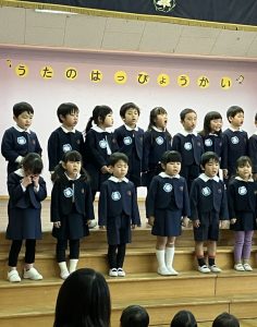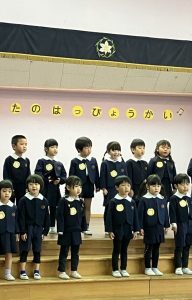今日は、全園児ホールに集まって歌の発表会をしました。今年度は、満3歳児クラス、年長組も参加し、全クラスの発表を皆で聴きました♬