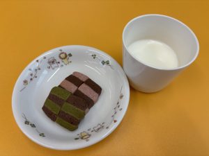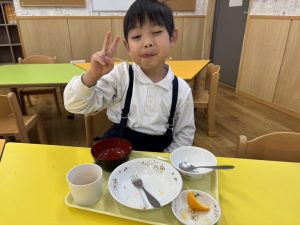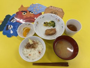 給食では可愛らしい鬼のご飯を食べ、豆まきに使う大豆入の鬼除け汁を飲んで、鬼払い!!
