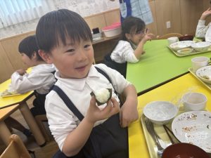 「できたよ!」と嬉しそうな表情で見せてくれました😊自分で作ったおにぎりは、特別だったようで、出来上がるとすぐに大きなお口で頬張りあっという間に完食していました。