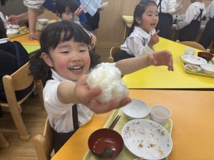 炊きたてのご飯を「まるがいいな」「さんかくにする!」と、思い思いの形に握っていました😊