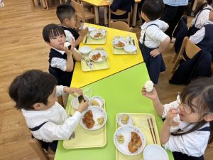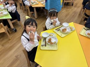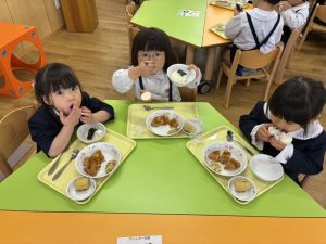 「できたよ!」と嬉しそうな表情で見せてくれました😊自分で作ったおにぎりは、特別だったようで、出来上がるとすぐに大きなお口で頬張りあっという間に完食していました。