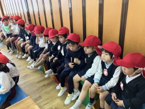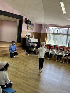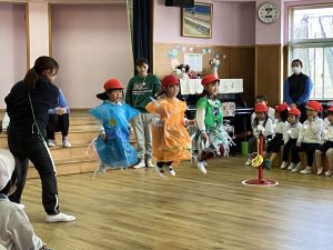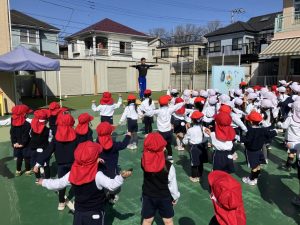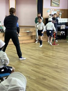 この縄跳び大会は、大きい組が皆に縄跳びを見せてくれる最後の機会でもあり、大きい組の姿を見て凄い!格好良い!と下の学年の子どもたちが感じる場にもなっています。今日をきっかけに縄跳びを手にしたり、真似してみたり…そこも私たち保育者が考えるねらいでもあります。