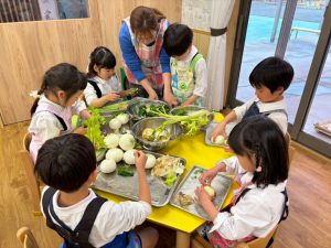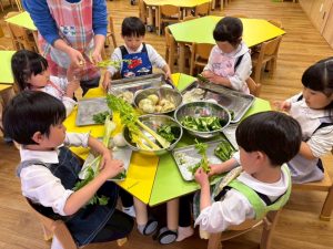 そして、すみれ組の12月、1月、3月生まれのお友達6名がリクエストメニューで使うお野菜の皮むきや種取りのお手伝いをしてくれましたよ!