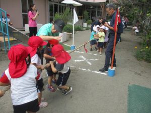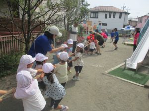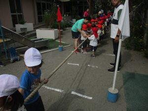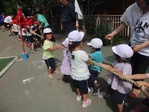 【年少中長組競技・・・綱引き】縦割りクラスで赤白組に分かれて競技を行います。今年度、赤組は、ゆり・ひまわり・たんぽぽ組、白組は、もも・すずらん・すみれ組で行います。今週は、2回対決を行い、赤、白組共に1勝ずつしています!今後、どうなっていくのか楽しみですね。ちゅうりっぷ組は、手作りうちわを持って応援をしてくれました!来年は、大玉転がしの年です。年少中長組競技は、綱引きと大玉転がしを交互に行って卒業までにどちらも経験出来るようになっています。ちゅうりっぷ組は、来年度以降、参加出来る種目が増えるのを楽しみにしていてくださいね!!