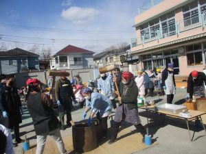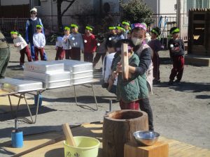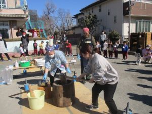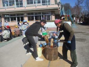 各クラス担任の先生と一緒に餅つきをしました。担任もお餅を最後につきあげました。