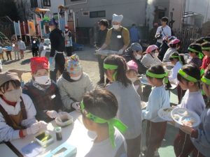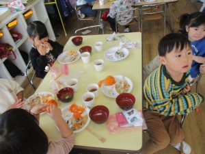 食後は、ホール遊びをしました。その後、歌の集会があり、最後に3月に行われる縄跳び大会の告知もありました。長々とび、基礎とび、フリースタイルの3種目があり、担当の先生たちが説明し、見本をみせてくれました。幼稚園でのお楽しみは続きますが、年長組は、一つひとつの行事が幼稚園最後になっていきますね…。残りの日々も楽しく過ごしましょう!
