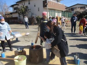 お子さんと一緒にお餅をつき、その後、大人でやってみたい方々で最後お餅をつきあげました。