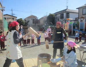 今年度から、スタートした満3歳児クラスのちゅうりっぷ組は、希望制で親子参加型の餅つきをしました。(今回、保育参観も兼ねています)